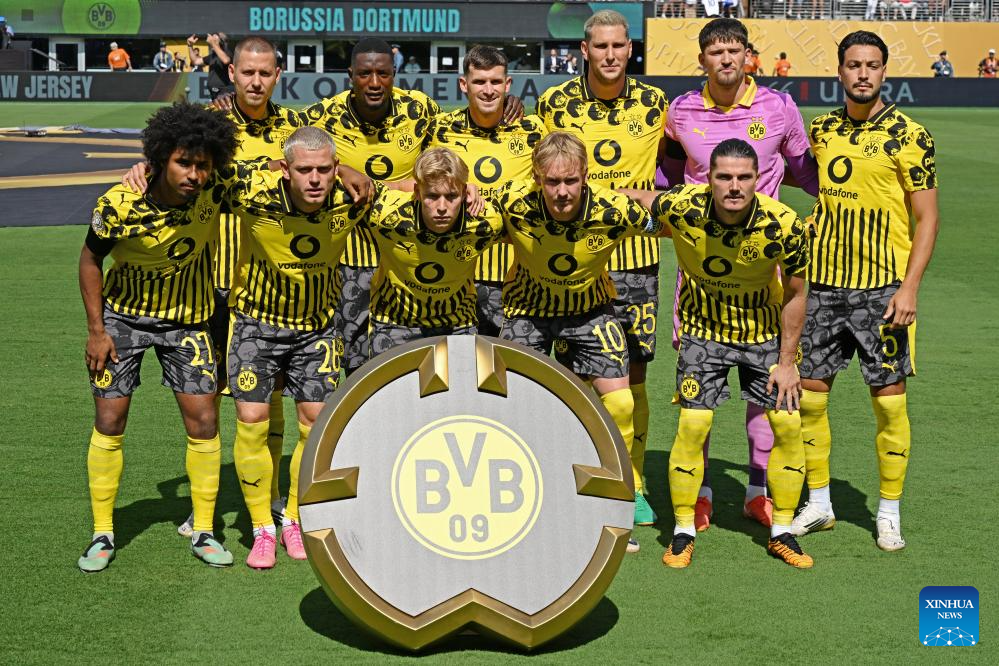 The starting line-up pose for a group photo ahead of the quarterfinal match between Real Madrid (Spain) and Borussia Dortmund (Germany) at the FIFA Club World Cup 2025 in New Jersey, the United States, July 5, 2025. (Xinhua/Li Rui)