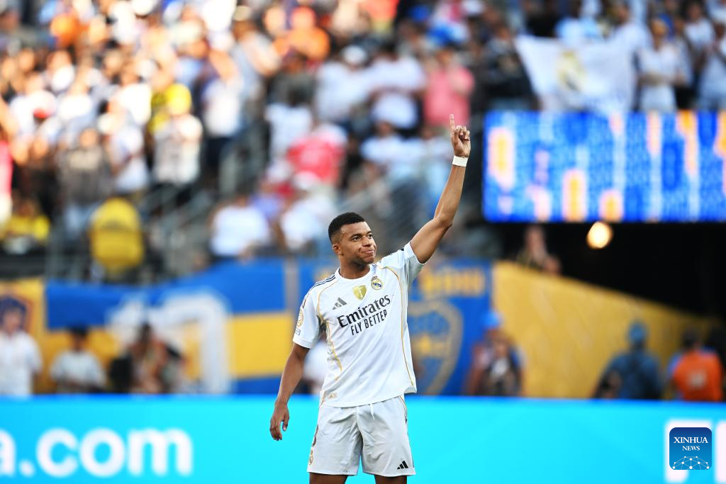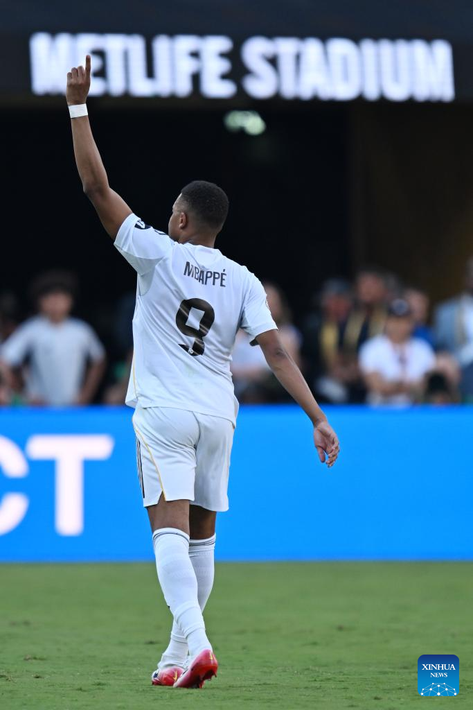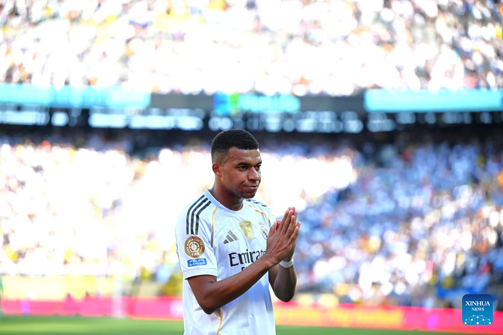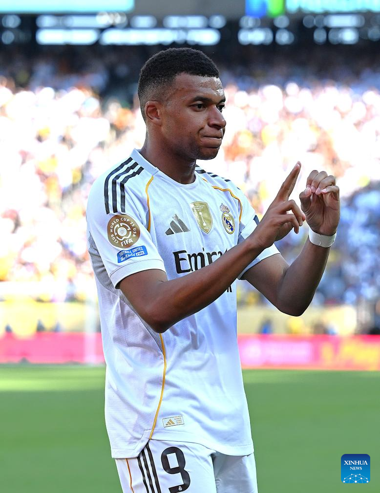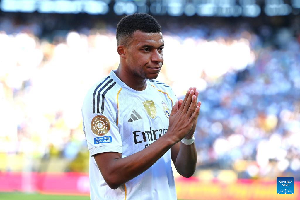 Kylian Mbappe of Real Madrid acknowledges the crowd during the warm-up before the quarterfinal match between Real Madrid (Spain) and Borussia Dortmund (Germany) at the FIFA Club World Cup 2025 in New Jersey, the United States, July 5, 2025. (Xinhua/Wu Xiaoling)