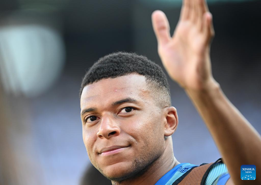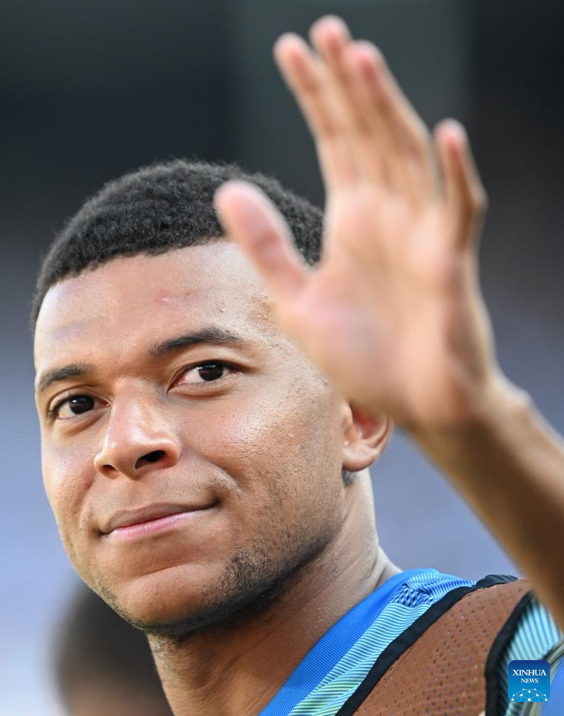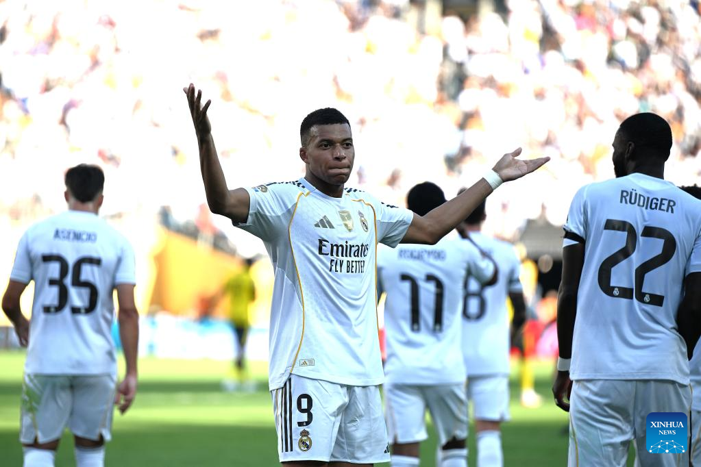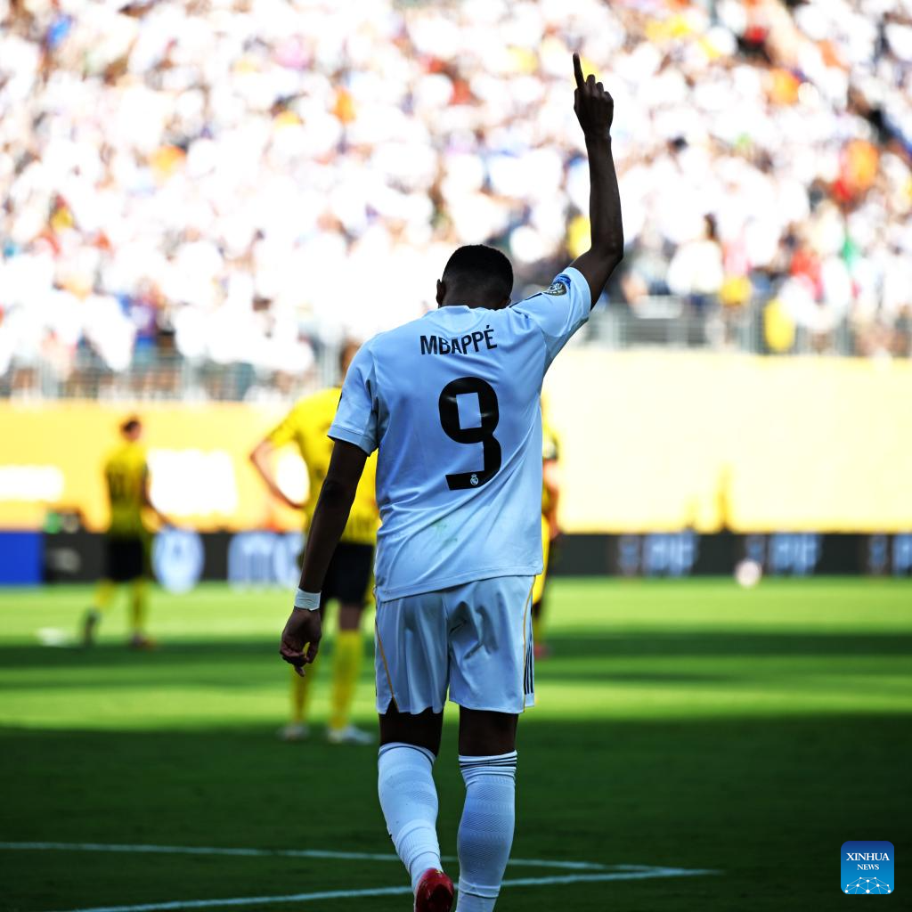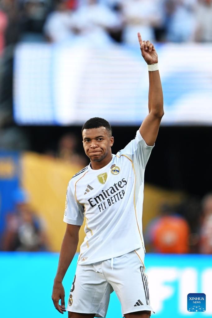 Kylian Mbappe of Real Madrid acknowledges the crowd during the warm-up before the quarterfinal match between Real Madrid (Spain) and Borussia Dortmund (Germany) at the FIFA Club World Cup 2025 in New Jersey, the United States, July 5, 2025. (Xinhua/Wu Xiaoling)