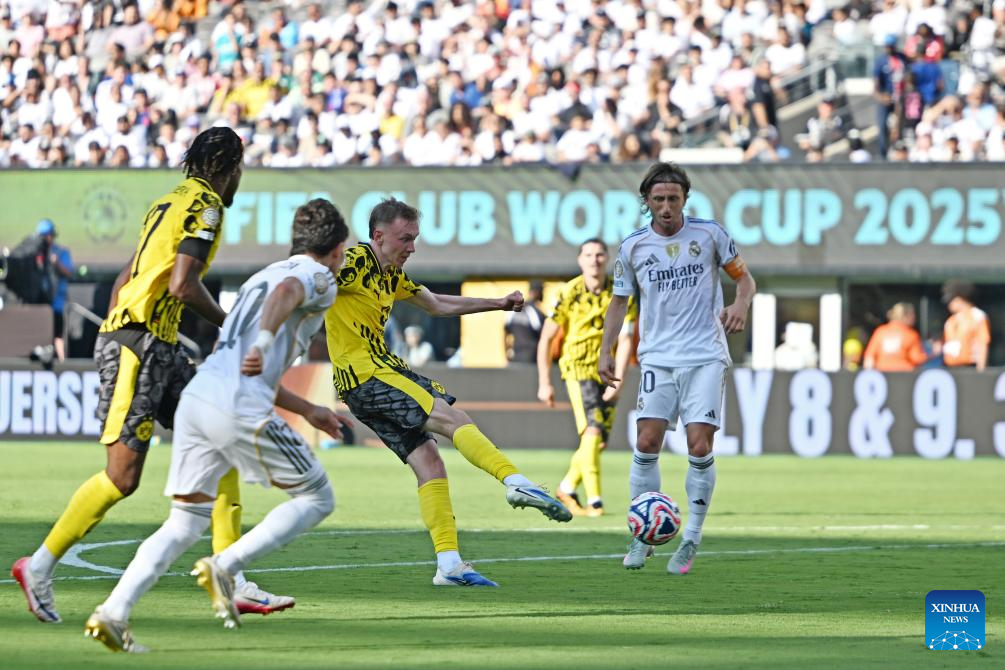Beier Maximilian (L) of Borussia Dortmund shoots during the quarterfinal match between Real Madrid (Spain) and Borussia Dortmund (Germany) at the FIFA Club World Cup 2025 in New Jersey, the United States, July 5, 2025. (Xinhua/Li Rui)
