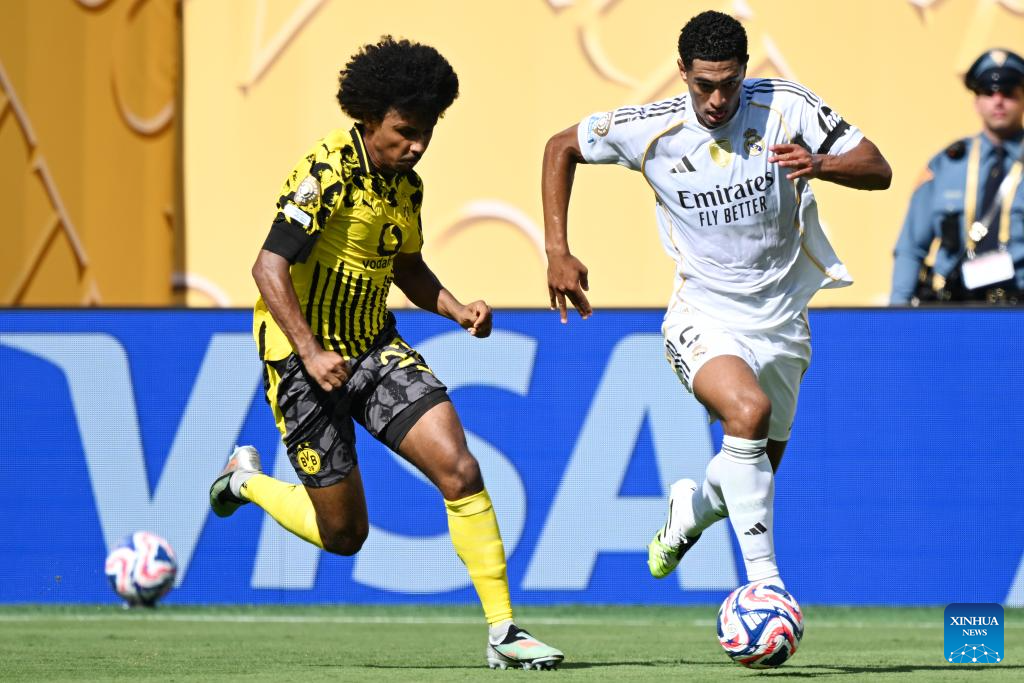 Jude Bellingham (R) of Real Madrid breaks through during the quarterfinal match between Real Madrid (Spain) and Borussia Dortmund (Germany) at the FIFA Club World Cup 2025 in New Jersey, the United States, July 5, 2025. (Xinhua/Li Rui)