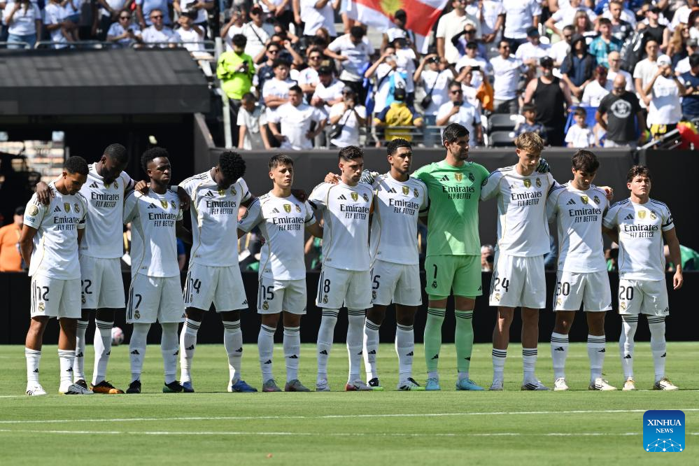 Players of Real Madrid observe a minute of silence to pay tribute to Liverpool's Portuguese forward Diogo Jota and his brother Andre Silva, who passed away after a car crash, ahead of the quarterfinal match between Real Madrid (Spain) and Borussia Dortmund (Germany) at the FIFA Club World Cup 2025 in New Jersey, the United States, July 5, 2025. (Xinhua/Li Rui)