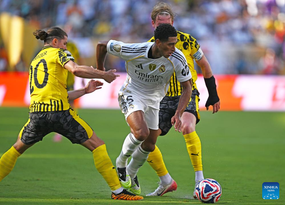 Jude Bellingham (C) of Real Madrid breaks through during the quarterfinal match between Real Madrid (Spain) and Borussia Dortmund (Germany) at the FIFA Club World Cup 2025 in New Jersey, the United States, July 5, 2025. (Xinhua/Li Rui)