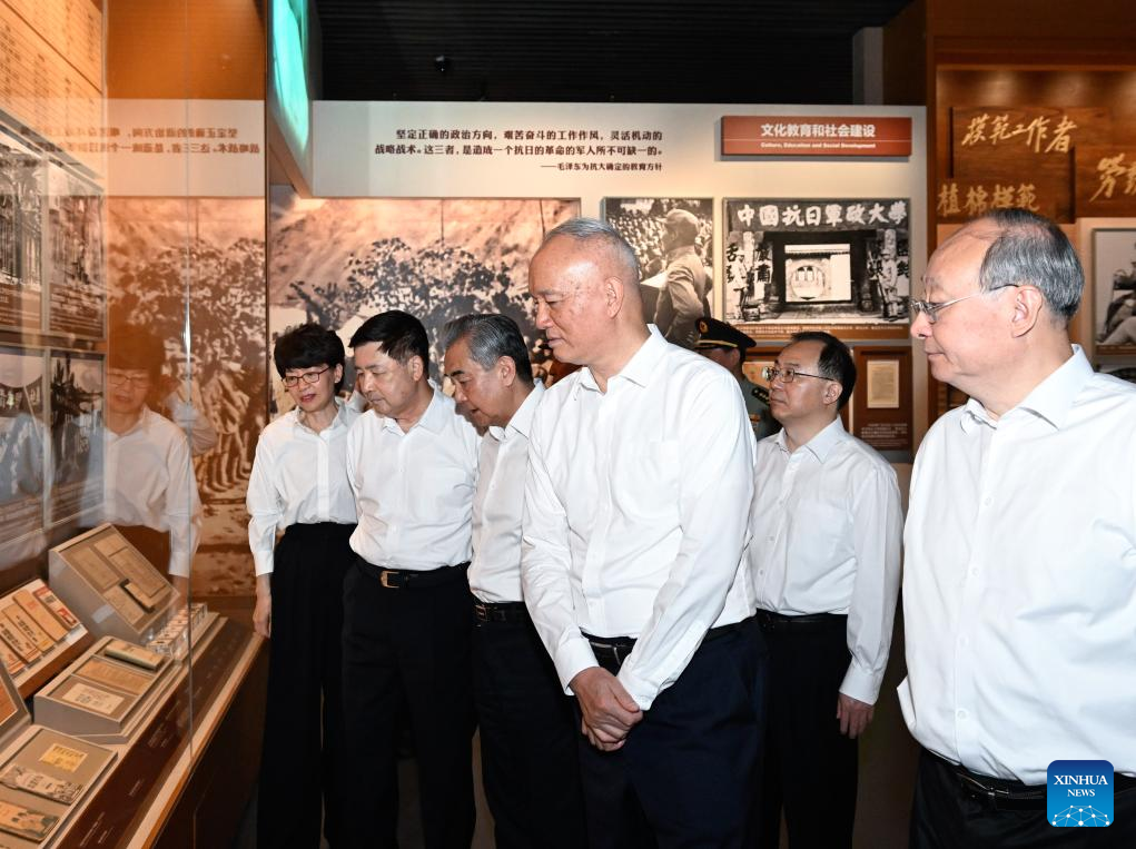 Cai Qi, a member of the Standing Committee of the Political Bureau of the Communist Party of China (CPC) Central Committee and a member of the Secretariat of the CPC Central Committee, visits an exhibition themed "For National Liberation and World Peace" in Beijing, capital of China, July 7, 2025. China on Monday held a ceremony to mark the 88th anniversary of the start of the entire nation's resistance against Japanese aggression, and launched an exhibition themed "For National Liberation and World Peace" at the Museum of the War of Chinese People's Resistance Against Japanese Aggression.