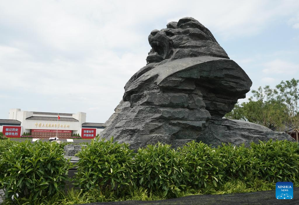 A "wakened lion" sculpture is pictured in front of the Museum of the War of Chinese People's Resistance Against Japanese Aggression in Beijing, capital of China, July 7, 2025. The Museum of the War of Chinese People's Resistance Against Japanese Aggression will reopen on July 8, offering admission fee-free and reservation-free visits to the public.
