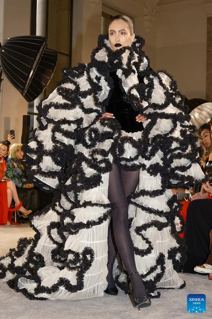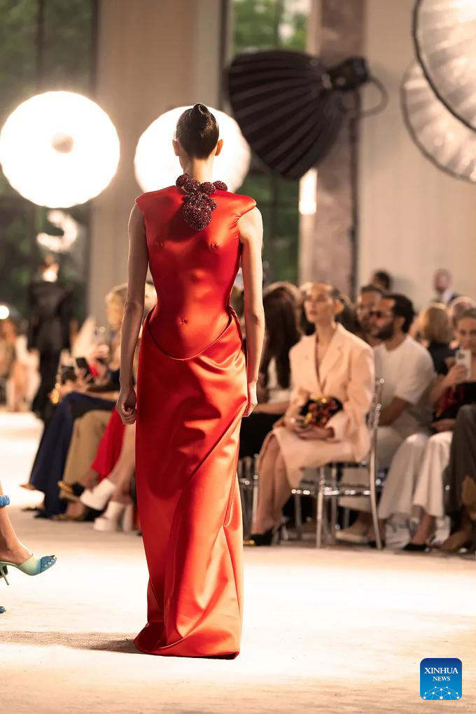 A model presents a creation by Schiaparelli during the Haute Couture Fall/Winter 2025-2026 fashion show in Paris, France, July 7, 2025. (MeetEurope/Handout via Xinhua)