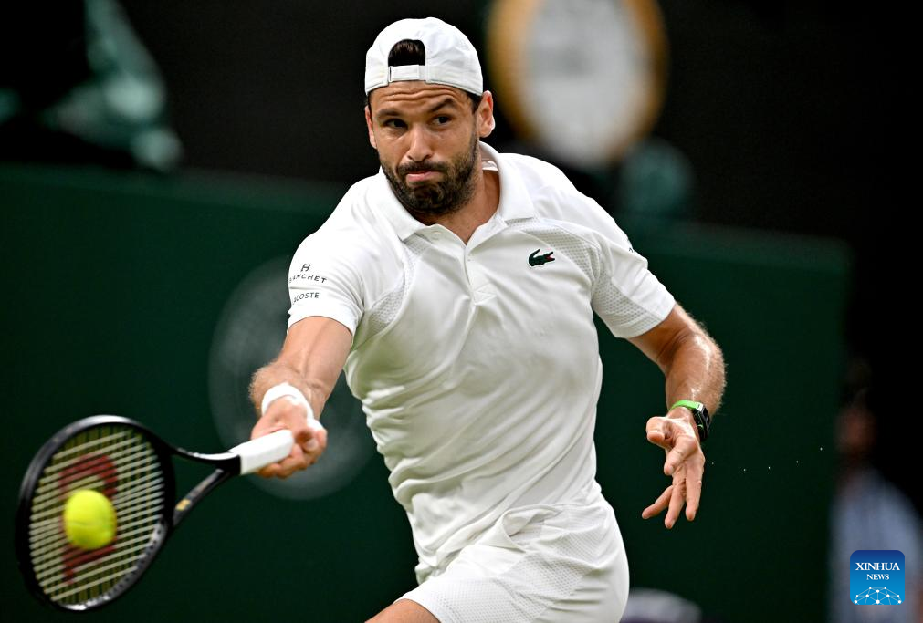 Grigor Dimitrov hits a return during the men's singles round of 16 match between Grigor Dimitrov of Bulgaria and Jannik Sinner of Italy at the Wimbledon Tennis Championships in London, Britain, July 7, 2025. (Xinhua/Li Ying)