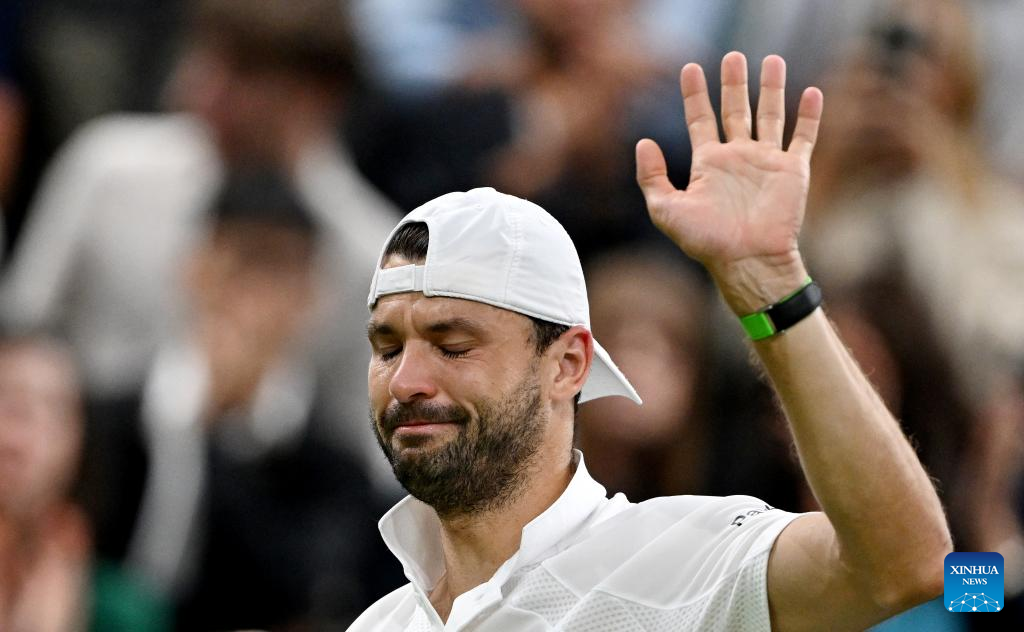 Grigor Dimitrov waves to spectators after deciding to retire from the match due to injury during the men's singles round of 16 match between Grigor Dimitrov of Bulgaria and Jannik Sinner of Italy at the Wimbledon Tennis Championships in London, Britain, July 7, 2025. (Xinhua/Li Ying)