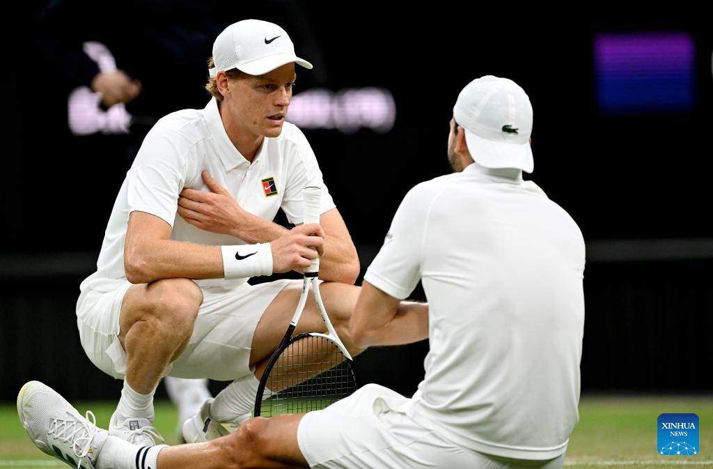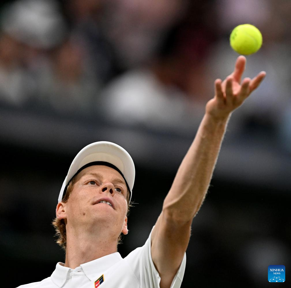 LONDON, July 7 (Xinhua) -- Men's top seed Jannik Sinner advanced to the Wimbledon quarterfinals under unfortunate circumstances on Monday after Grigor Dimitrov was forced to retire due to right pectoral injury while leading their fourth-round clash by two sets.