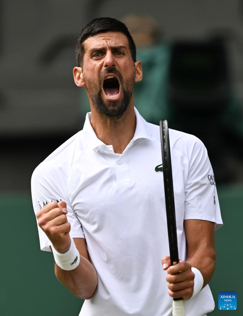 Novak Djokovic celebrates scoring during the men's singles fourth round match between Novak Djokovic of Serbia and Alex de Minaur of Australia at the Wimbledon Tennis Championships in London, Britain, July 7, 2025. (Xinhua/Li Ying)