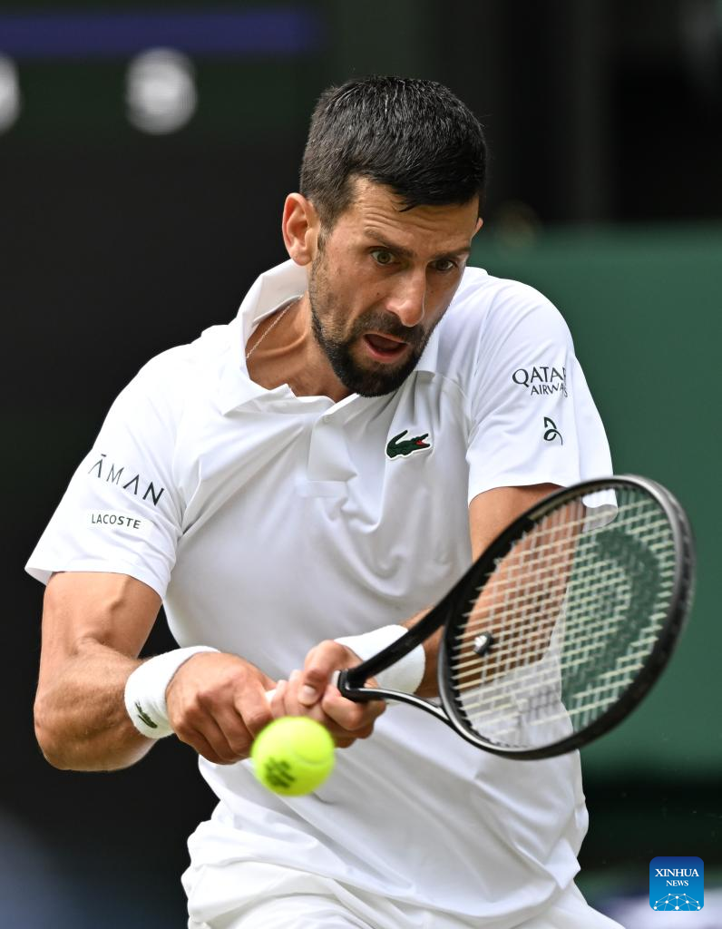 Novak Djokovic hits a return during the men's singles fourth round match between Novak Djokovic of Serbia and Alex de Minaur of Australia at the Wimbledon Tennis Championships in London, Britain, July 7, 2025. (Xinhua/Li Ying)