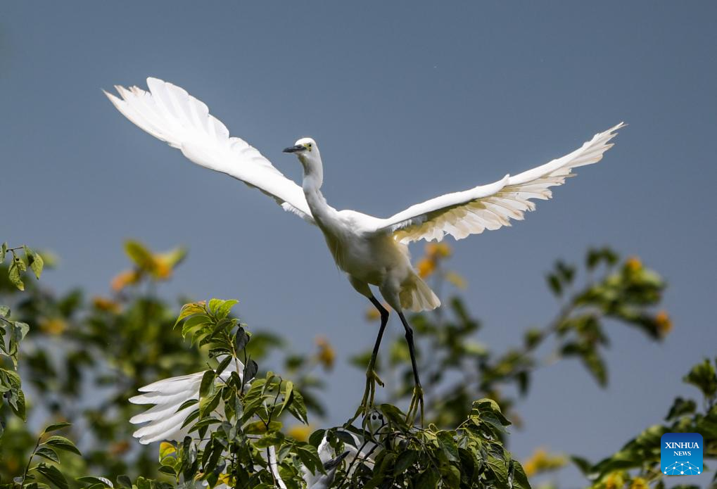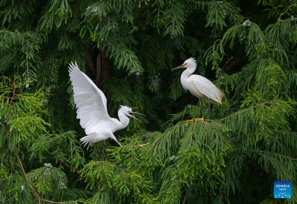 Egrets rest in Dianchi Haihong wetland park in Kunming, capital of southwest China's Yunnan Province, July 7, 2025. The abundant fish and shrimp in Dianchi Haihong wetland park attract a large number of egrets, herons and other birds during summer. (Xinhua/Chen Xinbo)