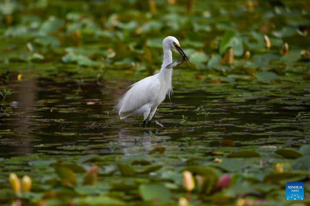 An egret preys in Dianchi Haihong wetland park in Kunming, capital of southwest China's Yunnan Province, July 7, 2025. The abundant fish and shrimp in Dianchi Haihong wetland park attract a large number of egrets, herons and other birds during summer. (Xinhua/Chen Xinbo)