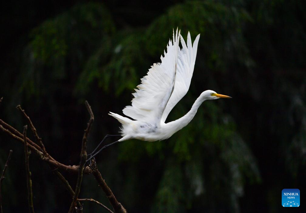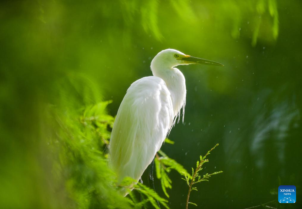 This photo taken on July 7, 2025 shows an egret in Dianchi Haihong wetland park in Kunming, capital of southwest China's Yunnan Province. The abundant fish and shrimp in Dianchi Haihong wetland park attract a large number of egrets, herons and other birds during summer. (Xinhua/Chen Xinbo)