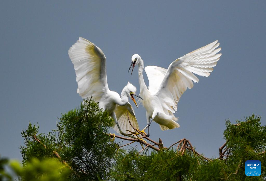 Egrets frolic in Dianchi Haihong wetland park in Kunming, capital of southwest China's Yunnan Province, July 7, 2025. The abundant fish and shrimp in Dianchi Haihong wetland park attract a large number of egrets, herons and other birds during summer. (Xinhua/Chen Xinbo)