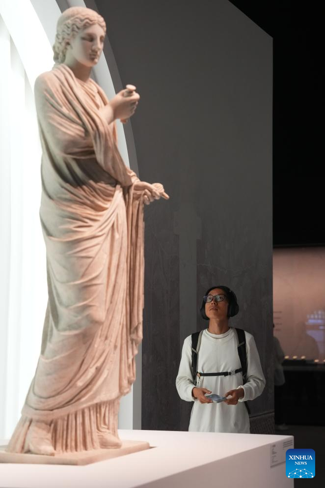 A visitor visits the exhibition "Meet Pompeii: The Eternal City" at the Hunan Museum in Changsha, capital of central China's Hunan Province, July 8, 2025. This exhibition showcasing cultural relics from ancient Pompeii opened here on Tuesday.