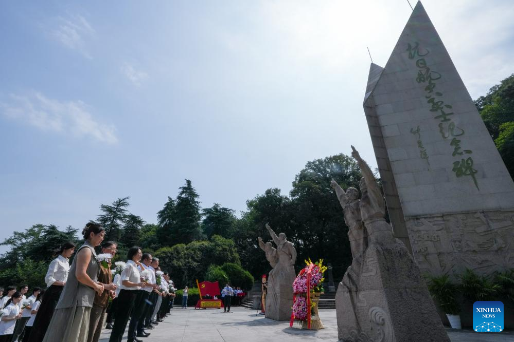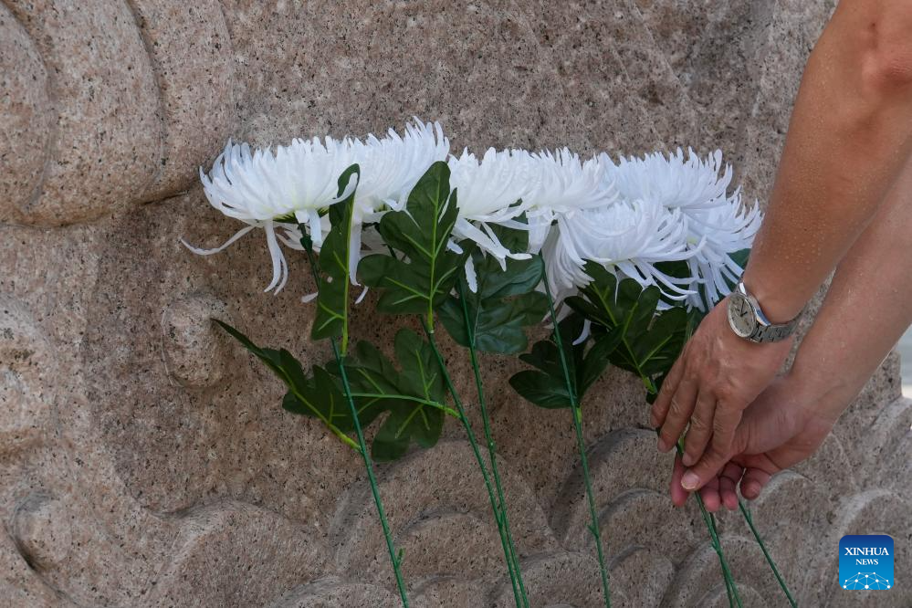 A visitor lays flowers in front of a monument to martyrs at the Nanjing Anti-Japanese Aviation Martyrs Memorial Hall in Nanjing, east China's Jiangsu Province, on July 7, 2025. A series of commemorative events and exhibitions marking the 80th anniversary of the victory in the Chinese People's War of Resistance Against Japanese Aggression and the World Anti-Fascist War were held here on Monday. (Xinhua/Li Bo)