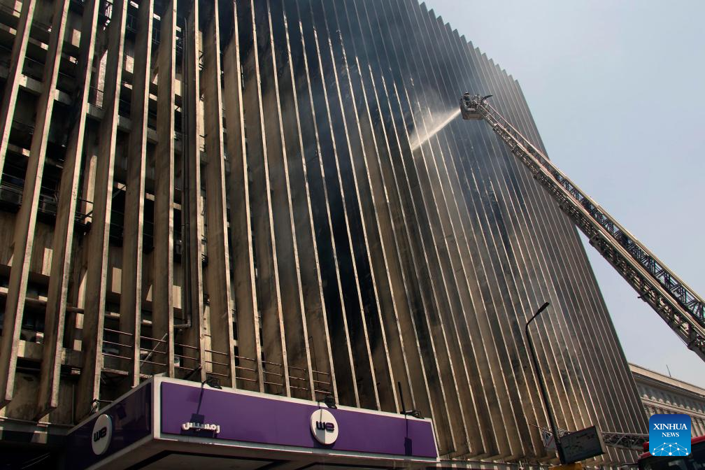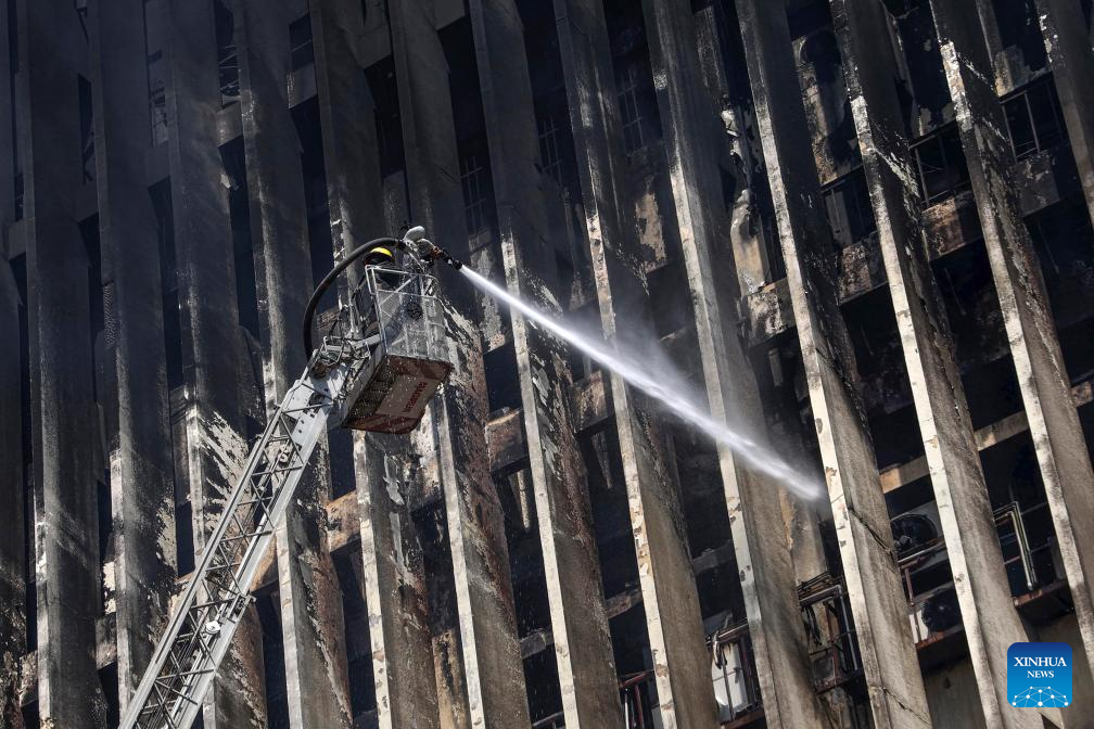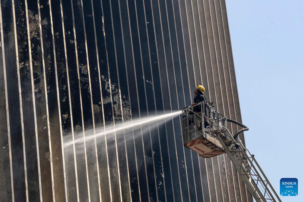 Firefighters cool down the central telecommunications building after a fire in Cairo, Egypt, on July 8, 2025. At least four people were killed and 27 others injured in a massive fire that broke out Monday at a central telecommunications building in downtown Cairo, Egypt's Health Ministry said Tuesday. (Xinhua/Ahmed Gomaa)