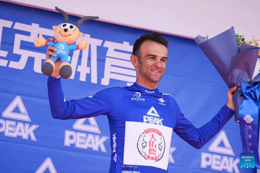 Saeid Safarzadeh of Tianyoude Hotel Cycling Team celebrates in the blue jersey on the podium after Stage 4 of the Tour of Magnificent Qinghai International Road Cycling Race from Menyuan to Qilian, northwest China's Qinghai Province, July 9, 2025. (Xinhua/Qi Zhiyue)