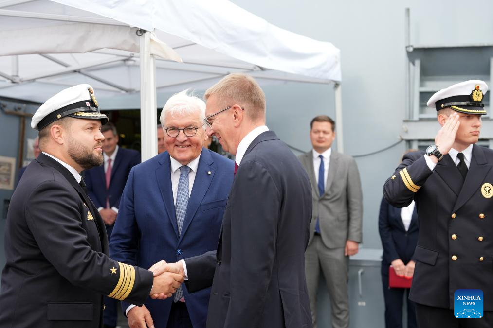 German Federal President Frank-Walter Steinmeier (2nd L, Front) and Latvian President Edgars Rinkevics (3rd L, Front) visit a German Navy vessel participating in NATO's "Baltic Sentry" operation in the Baltic Sea in Riga, Latvia, on July 8, 2025. German Federal President Frank-Walter Steinmeier concluded his visit to Latvia on Tuesday, following a stop in Lithuania. (Photo by Edijs Palens/Xinhua)