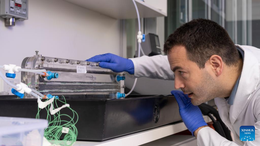 Associate Professor Juan Felipe Torres from the Australian National University (ANU) conducts experiments to extract valuable materials from brine deposits at ANU in Canberra, Australia, May 10, 2024. (Photo by Jamie Kidston/Xinhua)