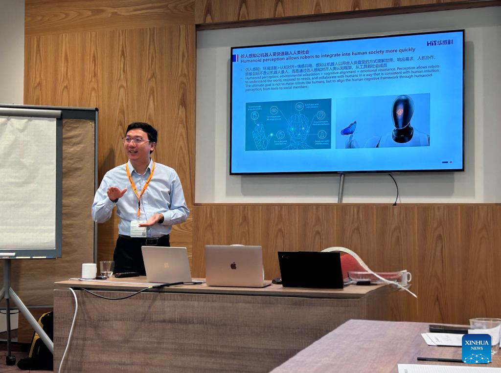 Huaweike CEO Zhu Xiaohui attends a roundtable on robot technology in Munich, Germany, June 26, 2025. (Li You/Wuhan Huaweike Intelligent Technology Co., Ltd./Handout via Xinhua)