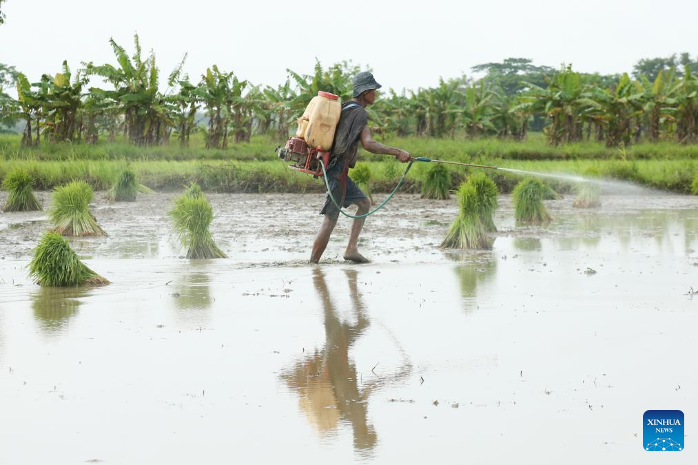 A farmer works in a paddy field on the outskirts of Yangon, Myanmar, July 8, 2025. (Xinhua/Myo Kyaw Soe)