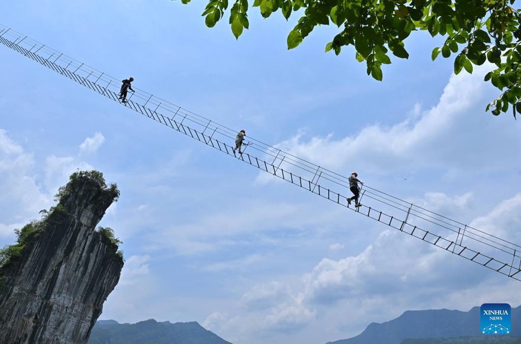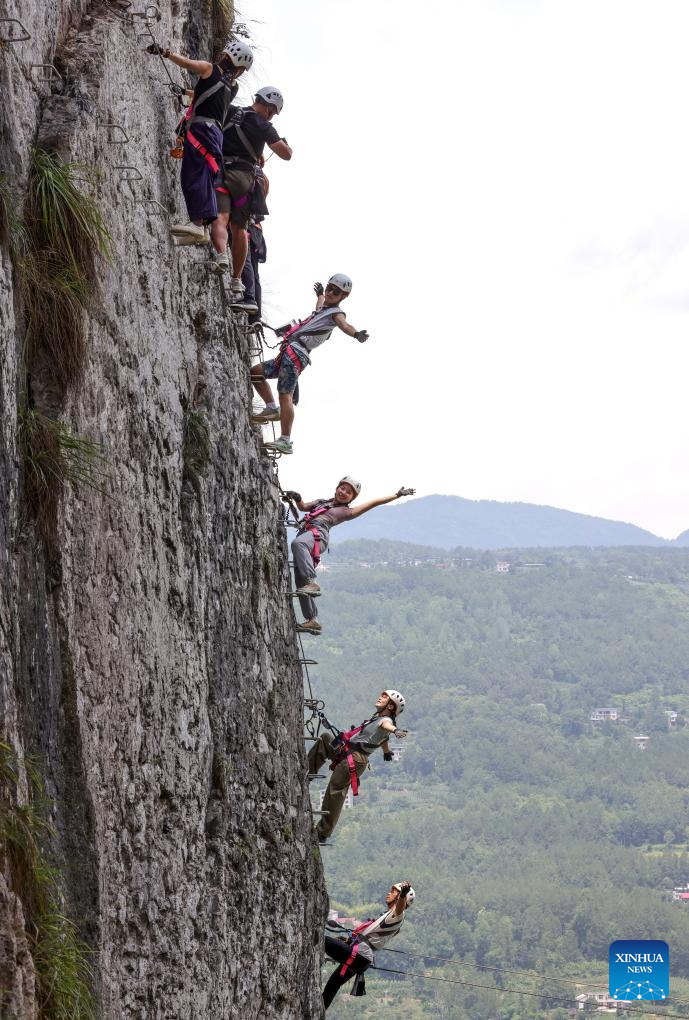 Tourists climb a ladder at a scenic area in Xintang Township, Enshi City, central China's Hubei Province, July 8, 2025. Taking advantage of the natural resources, local authorities of Enshi Tujia and Miao Autonomous Prefecture have built sports bases for rafting, rock climbing, rappelling, kayaking, paddleboarding, etc. By hosting sports events and inviting teams to organize sports training, the prefecture provides fresh ways for more and more urbanites to experience China's rural landscapes. (Xinhua/Wu Zhizun)