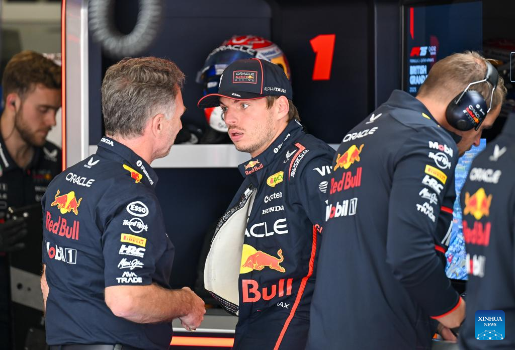 Christian Horner (2nd L) talks with Red Bull Racing's driver Max Verstappen (C) of the Netherlands during a free practice of the Formula One British Grand Prix 2025 at the Silverstone Circuit, in Sliverstone, Britain, July 4, 2025. Christian Horner has been dismissed as team principal and CEO of Red Bull Racing, ending a 20-year tenure that transformed the team into one of the most successful outfits in Formula 1 history. (Xinhua/Wu Lu)