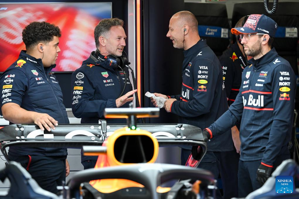 Christian Horner (2nd L) talks before a free practice of the Formula One British Grand Prix 2025 at the Silverstone Circuit, in Sliverstone, Britain, July 5, 2025. Christian Horner has been dismissed as team principal and CEO of Red Bull Racing, ending a 20-year tenure that transformed the team into one of the most successful outfits in Formula 1 history. (Xinhua/Wu Lu)
