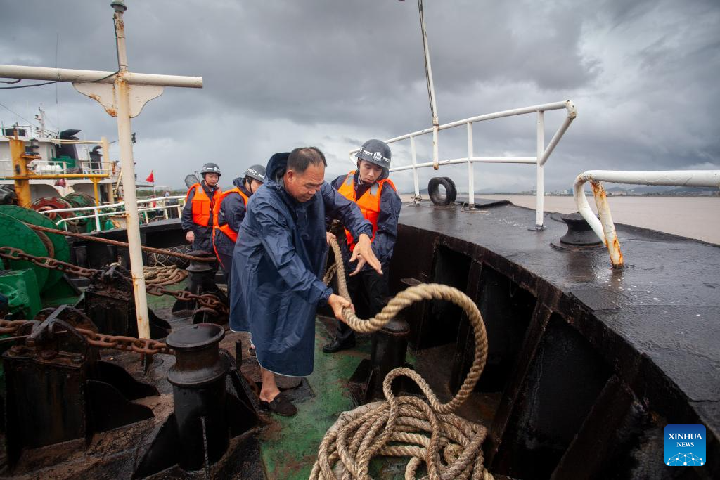 Police officers work with crew members to secure a mooring vessel at Sanjiangkou Wharf in Taizhou, east China's Zhejiang Province, July 7, 2025. China's Ministry of Water Resources on Monday activated a Level-IV emergency response to flooding in the eastern provinces of Zhejiang and Fujian as Typhoon Danas approaches. (Photo by Yu Yuexiang/Xinhua)