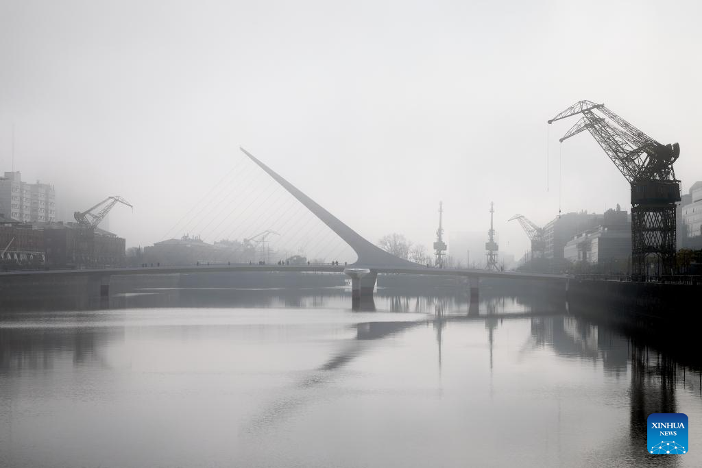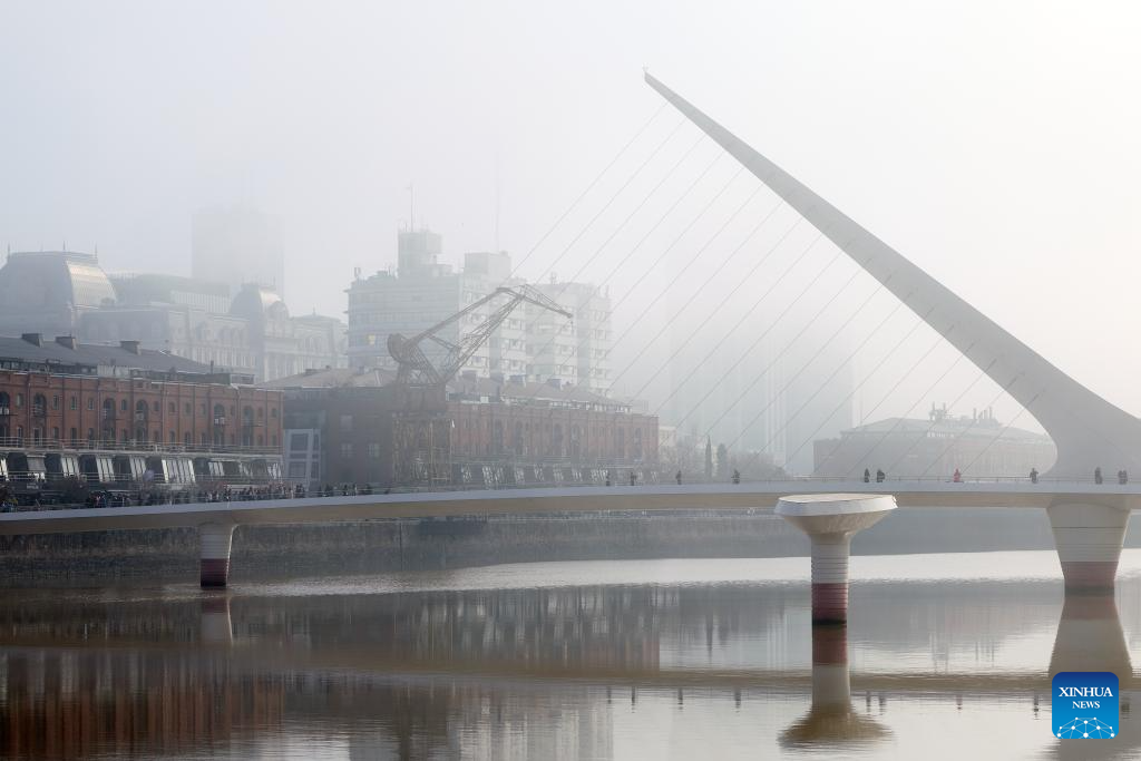 This photo taken on July 8, 2025, shows the Women Bridge in the fog in Buenos Aires, Argentina. According to Argentina's National Meteorological Service (SMN), central regions of the country were hit by widespread fog, prompting a violet-level weather alert for the capital Buenos Aires and surrounding provinces. The thick fog caused flight delays and diversions at multiple airports, disrupted urban transportation, and reduced visibility to less than 100 meters in some areas. (Xinhua/Meng Dingbo)