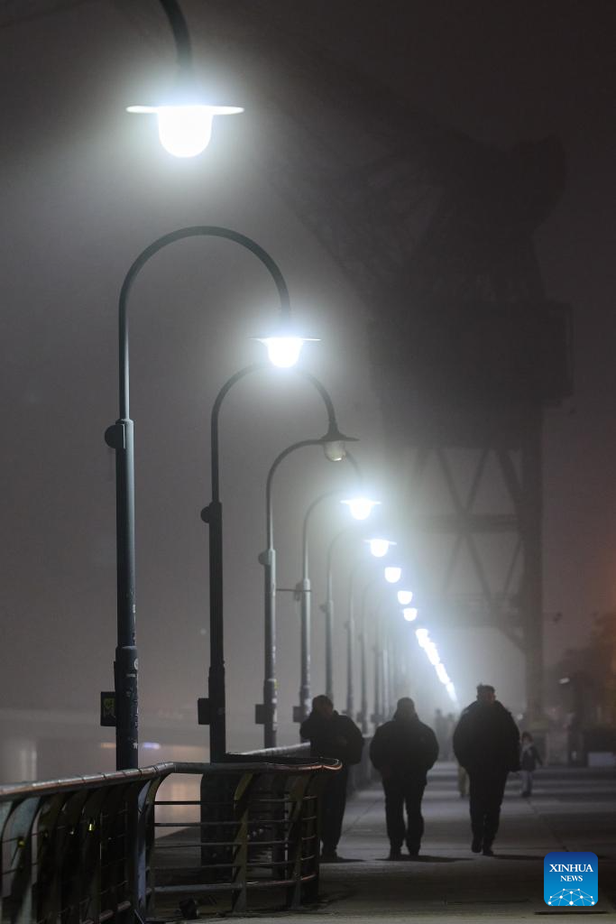 People walk through the fog-covered streets in Buenos Aires, Argentina, on July 8, 2025. According to Argentina's National Meteorological Service (SMN), central regions of the country were hit by widespread fog, prompting a violet-level weather alert for the capital Buenos Aires and surrounding provinces. The thick fog caused flight delays and diversions at multiple airports, disrupted urban transportation, and reduced visibility to less than 100 meters in some areas. (Xinhua/Meng Dingbo)