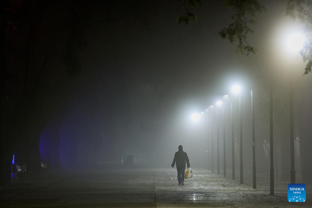A man walks through the fog-covered streets in Buenos Aires, Argentina, on July 8, 2025. According to Argentina's National Meteorological Service (SMN), central regions of the country were hit by widespread fog, prompting a violet-level weather alert for the capital Buenos Aires and surrounding provinces. The thick fog caused flight delays and diversions at multiple airports, disrupted urban transportation, and reduced visibility to less than 100 meters in some areas. (Xinhua/Meng Dingbo)