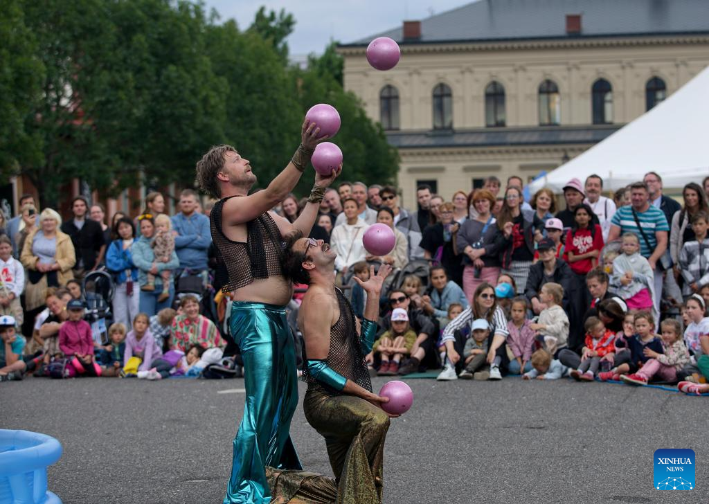 Artists stage a street theatre performance during the Prague Street Theatre Festival in Prague, the Czech Republic, July 9, 2025. The week-long festival opened here on Wednesday. (Photo by Dana Kesnerova/Xinhua)