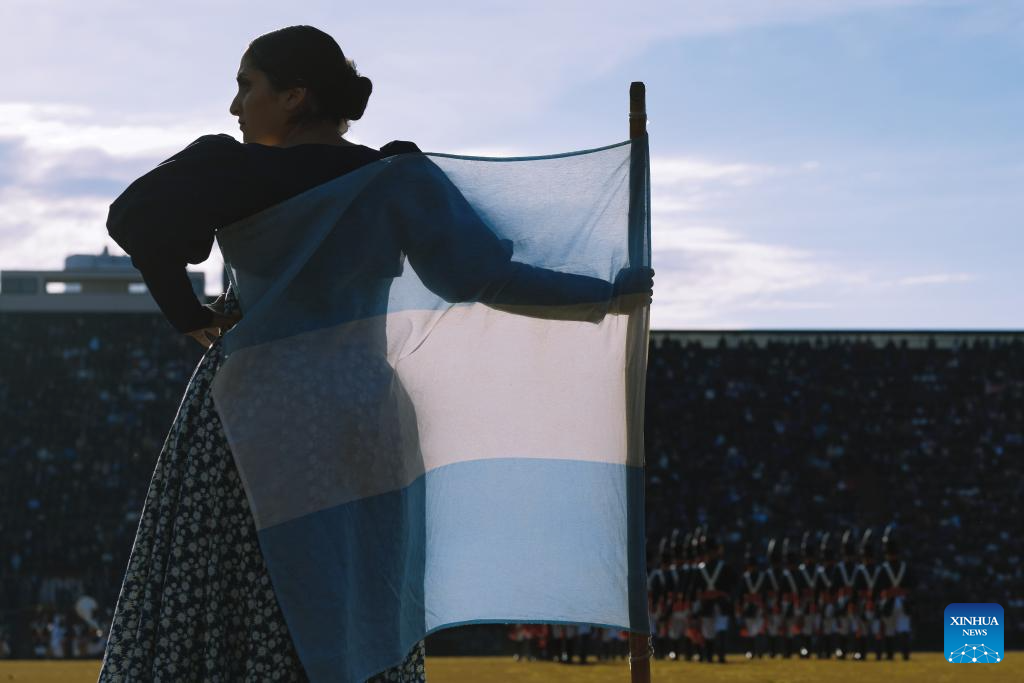 A woman dressed in traditional costumes takes part in a Military Bands Festival held to celebrate the 209th anniversary of Argentina's Independence Day in Buenos Aires, Argentina, on July 9, 2025. Argentina commemorated on Wednesday the 209th anniversary of its independence from Spanish rule. (Xinhua/Meng Dingbo)