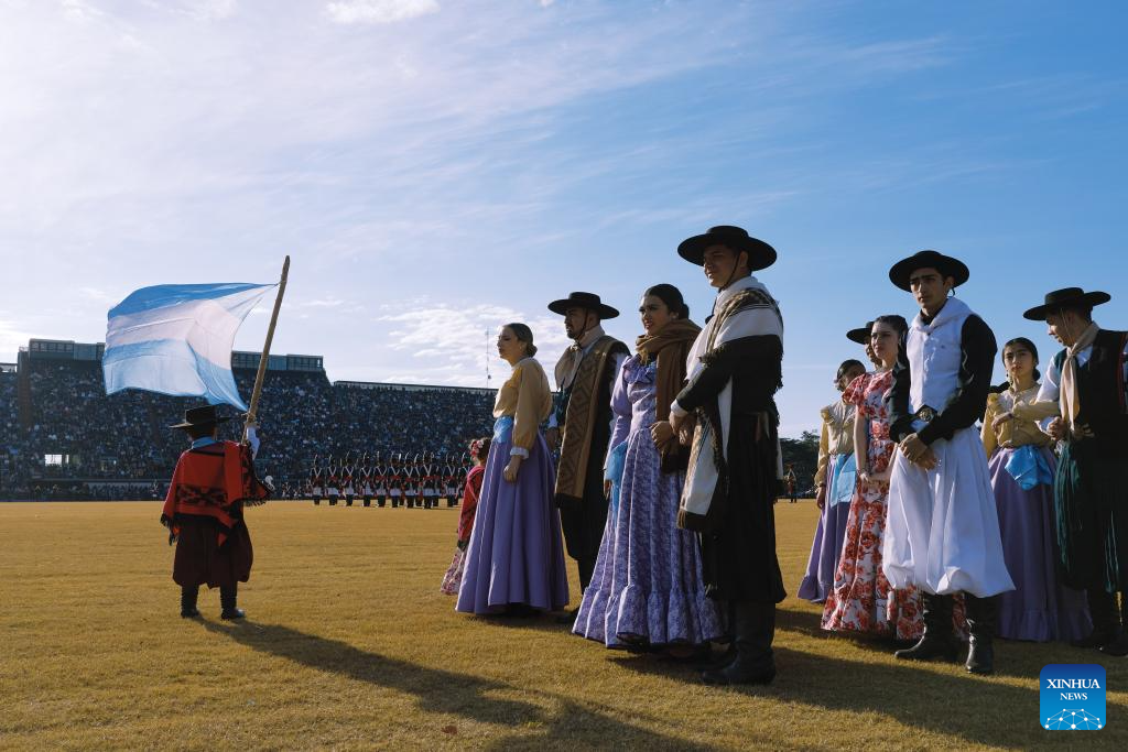 People dressed in traditional costumes take part in a Military Bands Festival held to celebrate the 209th anniversary of Argentina's Independence Day in Buenos Aires, Argentina, on July 9, 2025. Argentina commemorated on Wednesday the 209th anniversary of its independence from Spanish rule. (Xinhua/Meng Dingbo)