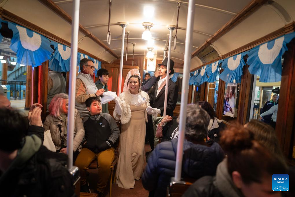 Actors dressed in historical costumes perform inside the metro Line A in Buenos Aires, Argentina, July 8, 2025. To mark Argentina's Independence Day, the Buenos Aires subway company opened restored vintage train cars and set up a declaration historical reenactment in a subway station, offering citizens and tourists a special experience. (Photo by Martin Zabala/Xinhua)