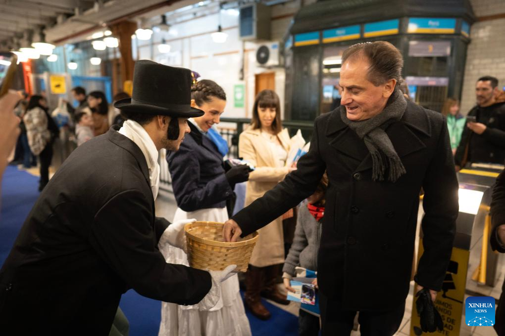 Actors dressed in historical costumes hand out rosettes to visitors inside the metro Line A in Buenos Aires, Argentina, July 8, 2025. To mark Argentina's Independence Day, the Buenos Aires subway company opened restored vintage train cars and set up a declaration historical reenactment in a subway station, offering citizens and tourists a special experience. (Photo by Martin Zabala/Xinhua)