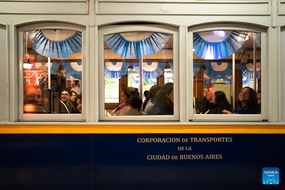 Visitors ride a vintage train inside the metro Line A in Buenos Aires, Argentina, July 9, 2025. To mark Argentina's Independence Day, the Buenos Aires subway company opened restored vintage train cars and set up a declaration historical reenactment in a subway station, offering citizens and tourists a special experience. (Photo by Martin Zabala/Xinhua)