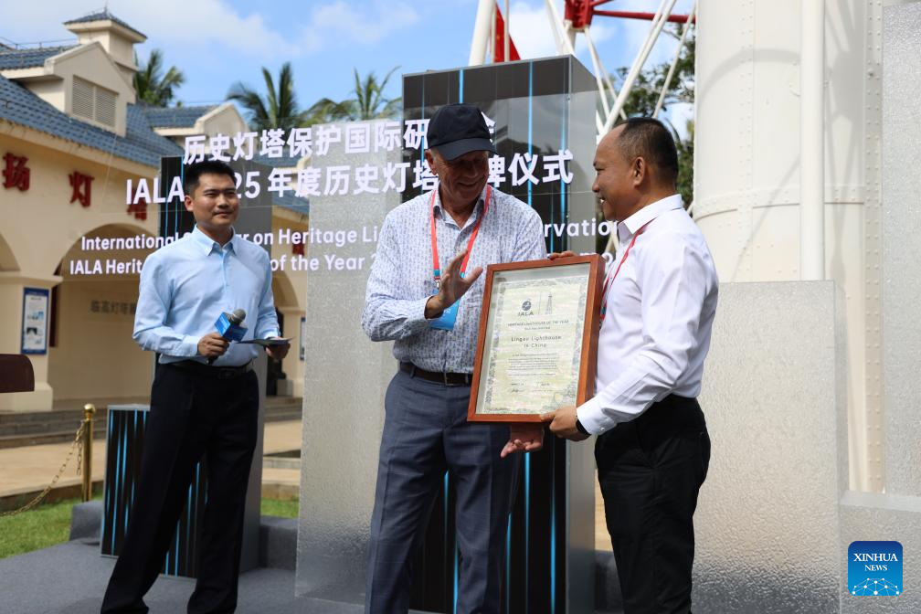 Francis Zachariae (C), secretary-general of the International Organization for Marine Aids to Navigation (IALA), presents the "Heritage Lighthouse of the Year 2025" award in Lingao, south China's Hainan Province, July 8, 2025. Lingao Lighthouse, located in China's southernmost island province of Hainan, was recently awarded the title of "Heritage Lighthouse of the Year 2025" by the IALA. (Xinhua/Guo Liangchuan)