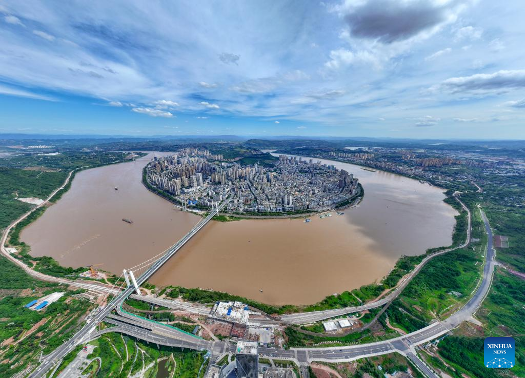 This panoramic aerial drone photo taken on July 3, 2025 shows a view of Jiangjin District in southwest China's Chongqing Municipality.
