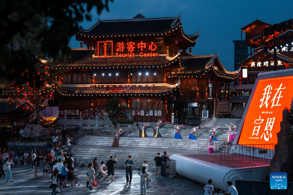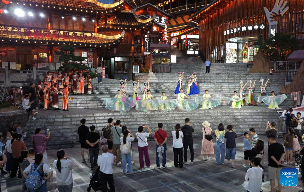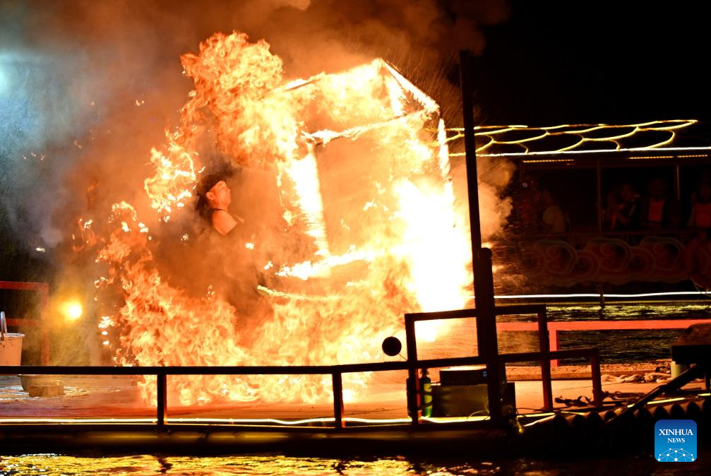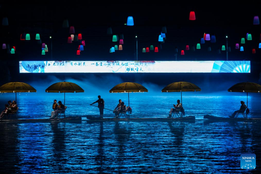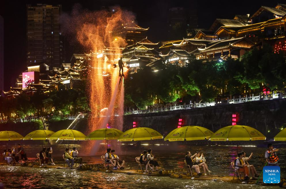 A folk artist performs on the Gongshui River in Xuan'en County, Enshi Tujia and Miao Autonomous Prefecture, central China's Hubei Province, July 9, 2025. In recent years, Xuan'en County of central China's Hubei Province has promoted nighttime tourism around the Gongshui River, which runs through the county. Activities and shows ranging from bamboo raft rides to molten iron fireworks attract visitors to enjoy the charm of the county under the lights. (Photo by Zhao Jun/Xinhua)