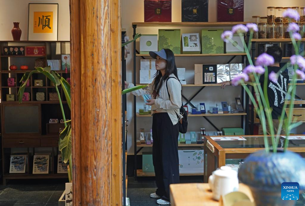 A tourist selects creative cultural products in Diaoyuan Ancient Village of Ji'an, east China's Jiangxi Province, July 9, 2025. Tucked into the undulating hills of Ji'an City in east China's Jiangxi Province, Diaoyuan Village has stood for over 1,100 years -- the layout from above bearing a striking resemblance to a Taoist Tai Chi diagram.