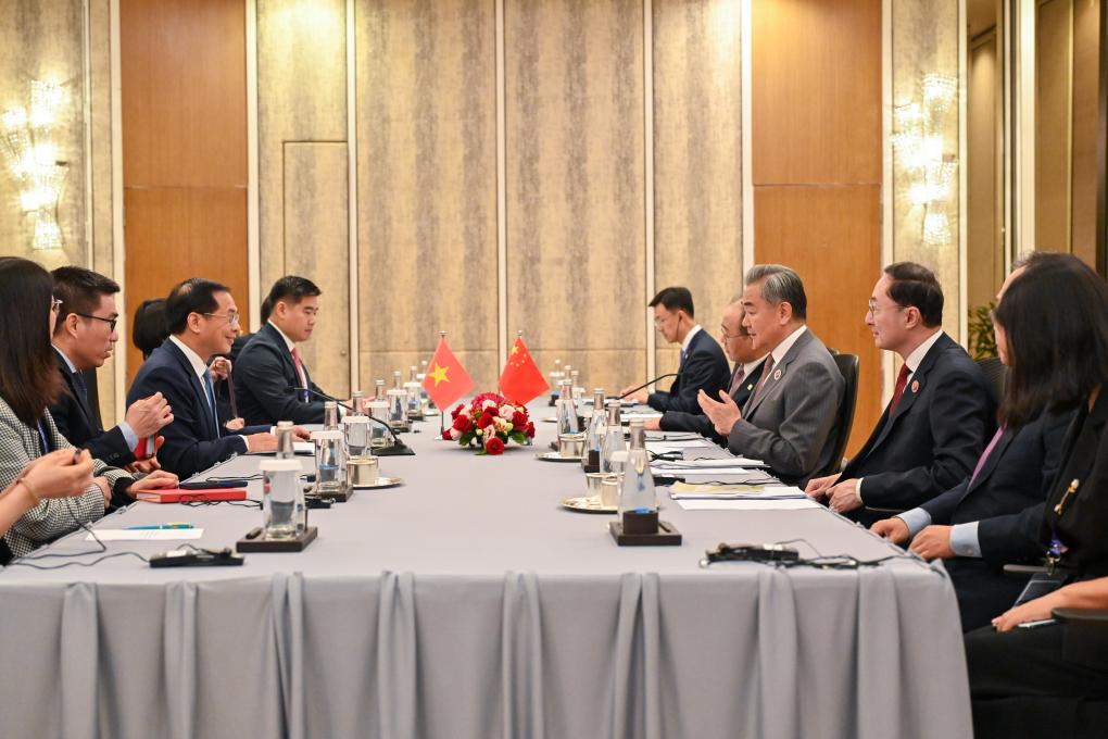 Chinese Foreign Minister Wang Yi, also a member of the Political Bureau of the Communist Party of China Central Committee, meets with Vietnamese Deputy Prime Minister and Foreign Minister Bui Thanh Son in Kuala Lumpur, Malaysia, July 10, 2025. (Photo by Chong Voon Chung/Xinhua)