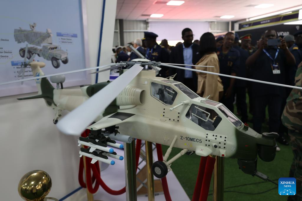 A model of helicopter is seen during the 4th Annual International Maritime Defense Exhibition and Conference (IMDEC) in Accra, Ghana, on July 8, 2025. The IMDEC 2025, hosted under the patronage of the Ghana Navy, plays a critical role in augmenting maritime defense initiatives in the Gulf of Guinea and across the African continent. (Photo by Seth/Xinhua)