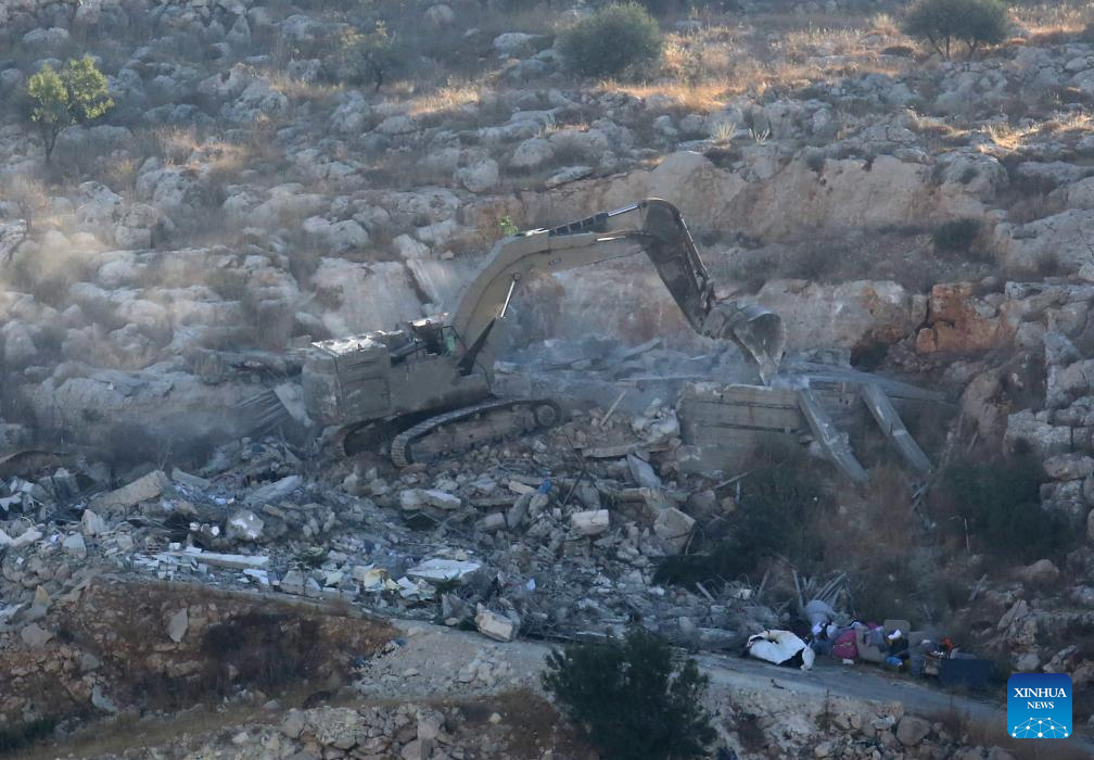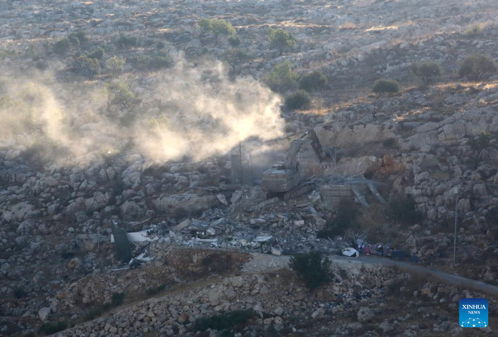 An Israeli excavator demolishes a Palestinian house, in the town of Rujeib, east of the West Bank city of Nablus, on July 9, 2025. (Photo by Nidal Eshtayeh/Xinhua)