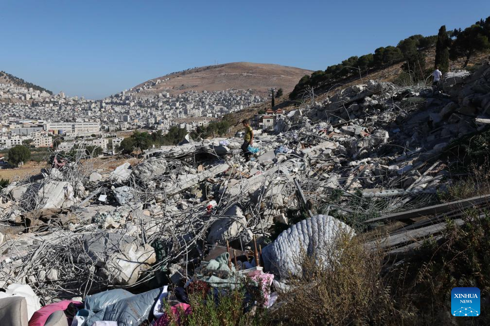 Palestinians inspect the rubble of a house demolished by an Israeli excavator, in the town of Rujeib, east of the West Bank city of Nablus, on July 9, 2025. (Photo by Nidal Eshtayeh/Xinhua)
