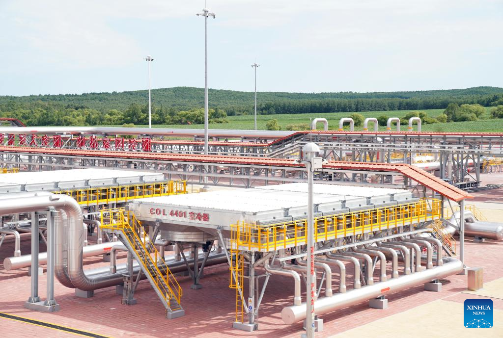 This photo taken on July 9, 2025 shows a view of a gas transmission pipeline station in Heihe, northeast China's Heilongjiang Province. As of July 10, the cumulative gas transmission volume of the China-Russia east-route natural gas pipeline's China section has surpassed 100 billion cubic meters. The pipeline's China section begins in Heihe, a city in the country's northeast bordering Russia, and transports natural gas from Siberia all the way south to Shanghai, China's economic and financial hub. (Xinhua/Wang Song)