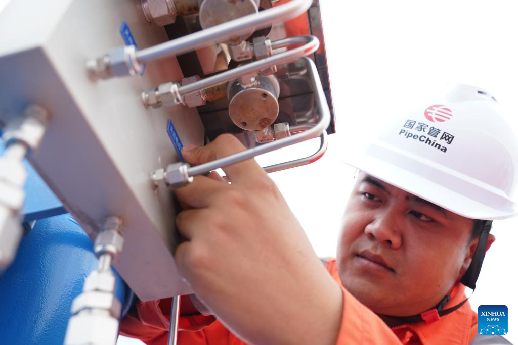 Workers maintain a facility at a gas transmission pipeline station in Heihe, northeast China's Heilongjiang Province, July 9, 2025. As of July 10, the cumulative gas transmission volume of the China-Russia east-route natural gas pipeline's China section has surpassed 100 billion cubic meters. The pipeline's China section begins in Heihe, a city in the country's northeast bordering Russia, and transports natural gas from Siberia all the way south to Shanghai, China's economic and financial hub. (Xinhua/Wang Song)